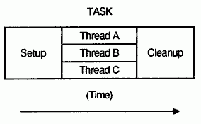In the work crew model, multiple threads work together on a single task. The task is divided into pieces that are performed in parallel, and each thread performs one piece. An example of a work crew is a group of people cleaning a house. Each person cleans certain rooms or performs certain types of work (washing floors, polishing furniture, and so forth), and each works independently. The following figure shows a task performed by three threads in a work crew model.