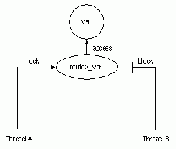 A mutex (mutual exclusion) is an object that multiple threads use to ensure the integrity of a shared resource that they access, most commonly shared data. A mutex has two states: locked and unlocked. For each piece of shared data, all threads accessing that data must use the same mutex; each thread locks the mutex before it accesses the shared data and unlocks the mutex when it is finished accessing that data. If the mutex is locked by another thread, the thread requesting the lock is blocked when it tries to lock the mutex if you call pthread_mutex_lock( ) (see the following figure). The blocked thread continues and is not blocked if you call pthread_mutex_trylock( ).