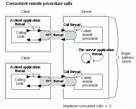 The following figure shows a server executing remote procedures in its two call threads, while the server application thread listens.