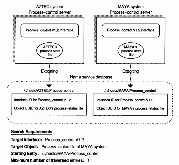 For some applications, the clients need to import an RPC resource that belongs to a specific system, and the clients can specify a server entry name to learn about a server on that system. For example, a process server that allows clients to monitor and control processes on a remote machine is useful only to that machine. The following figure illustrates this type of system-specific interpretation of the resource model.