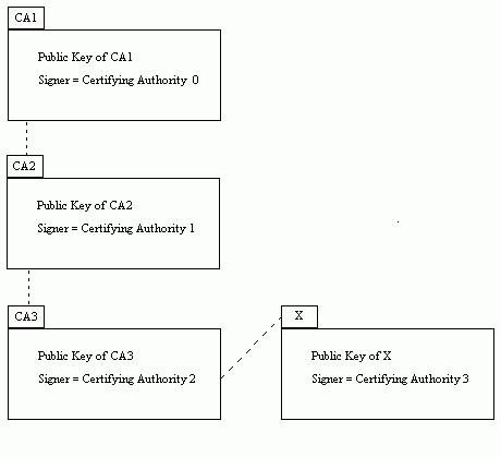 The following diagram shows how a certificate chain might be used to find the public key of a principal, X: