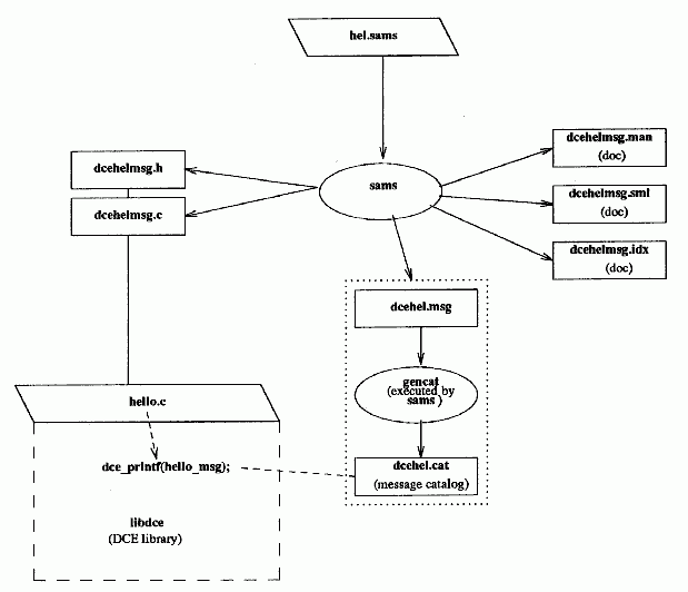 The following figure shows the relationship of the various files, both source and sams output, that go to make up DCE application code that uses the DCE messaging API.